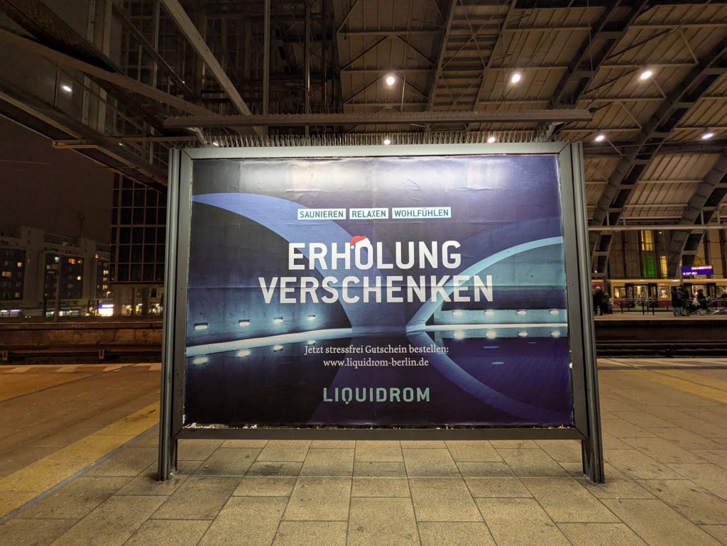 Hintergleisplakat mit dem Motiv von Liquidrom, gut sichtbar vom Bahnsteig aus